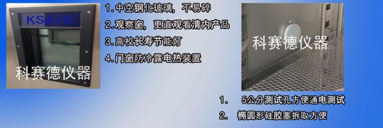 首先我們了解恒溫恒濕試驗機的視窗玻璃,它作用是為了觀察工作室。在做低溫測試(-40℃)時,恒溫恒濕試驗機的整個箱體都是冷的,唯獨置于艙門上的視窗玻璃是熱的,而且還有點燙手。因為恒溫恒濕試驗機里面面冷,外面熱會形成冰霜,所以科賽德儀器的觀察窗采用的都是發熱體內嵌式鋼化玻璃,防霧視窗玻璃能使客戶隨時都可以清晰的觀察試驗箱里面的試樣狀況了。