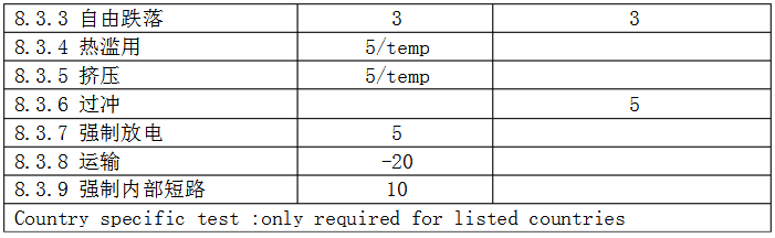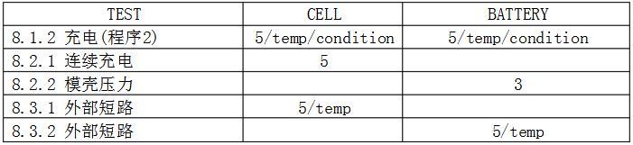 如果電芯被規定的最高或最低充電溫度超過了表4中預估的最高或最低溫度,那么這個電芯可以充電,如果適合試驗,應在規定預估中最高上限加5℃和在最低的下限減5℃。電芯應該滿足條款8.3.1、8.3.2、8.3.4、8.3.5和8.3.9。還應提供一個合理的闡述確保電芯的安全。